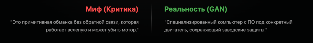 Вывод по «обманке»: Да, это обманка системы — но так работает любой чип-тюнинг. Вопрос не в термине, а в безопасности и эффективности реализации. GAN доказывает безопасность гарантией до €5 000 на двигатель.