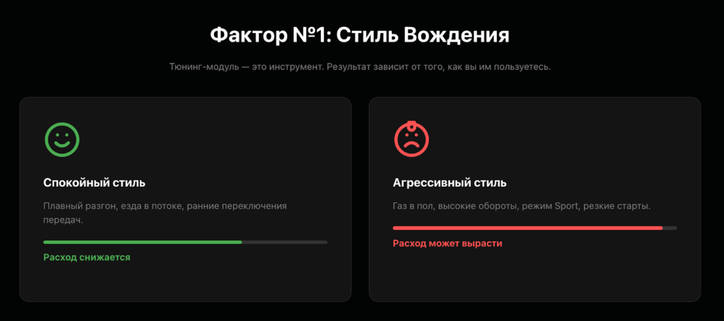 Факт: Чип-тюнинг не влияет на расход на холостом ходу, потому что модуль активен только под нагрузкой.