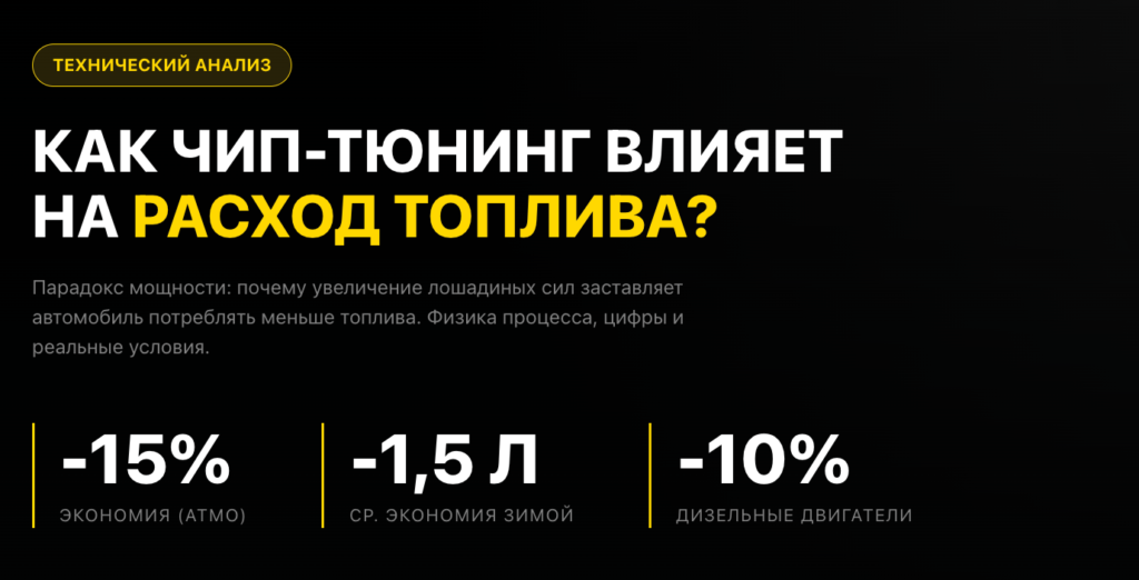 Реальность: Экономия топлива практически не зависит от чип-тюнинга напрямую. Она зависит в первую очередь от стиля вождения и технического состояния автомобиля. Снижение расхода — это скорее побочный эффект оптимизации работы двигателя, а не основная цель.