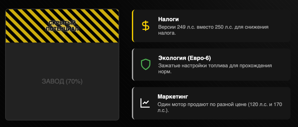 - Налоговые причины. В России за автомобиль до 250 л.с. платят 75 руб/л.с., а свыше 250 л.с. — уже 150 руб/л.с. Производитель выпускает версию на 249 л.с. специально для российского рынка.