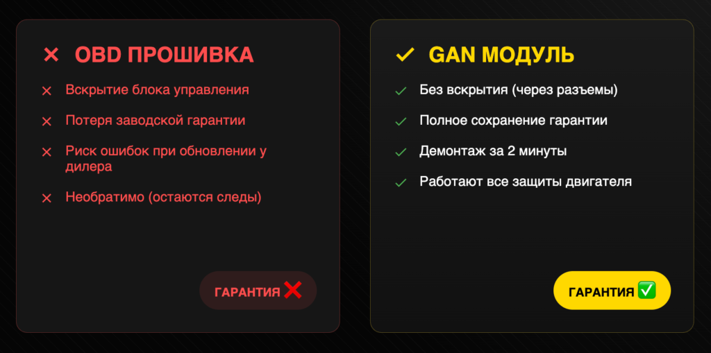 Вывод: если ваш автомобиль на гарантии — только внешний модуль. Это единственный способ сохранить заводскую гарантию и получить прирост мощности.