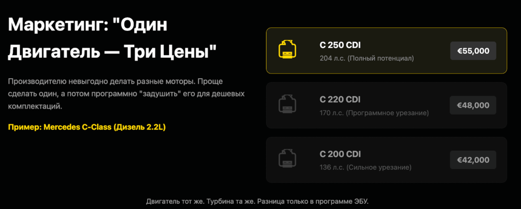 Автопроизводители программно занижают мощность двигателей на 20-30% при производстве. Один и тот же мотор используется в разных моделях с отличием только в настройках ЭБУ. Например, Mercedes C 200 CDI и C 220 CDI имеют идентичные двигатели — разница только в электронике. Это маркетинговая стратегия для расширения модельного ряда без затрат на разработку новых моторов.