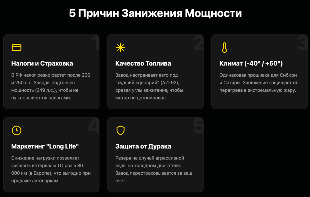 Причины программного ограничения: налоговые категории по мощности, требования страхования, различия в качестве топлива по странам, климатические условия эксплуатации и увеличение интервалов техобслуживания.